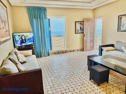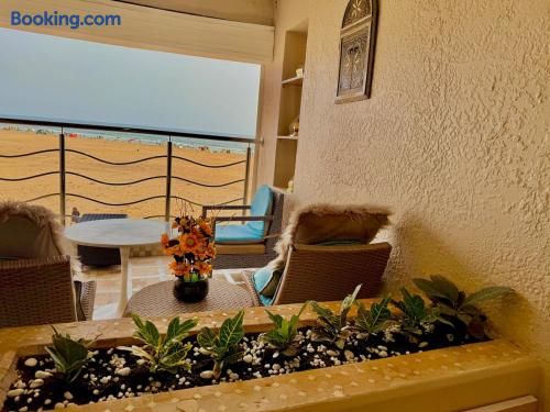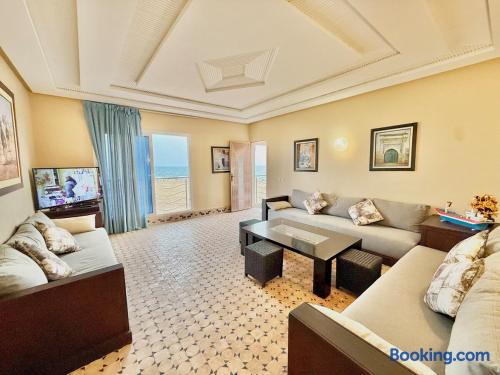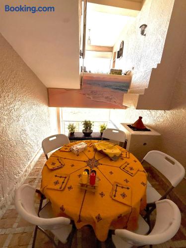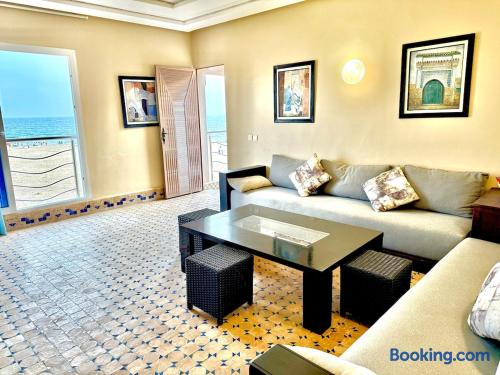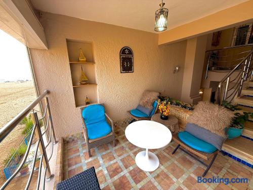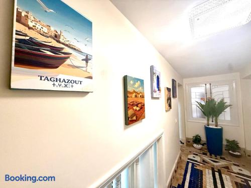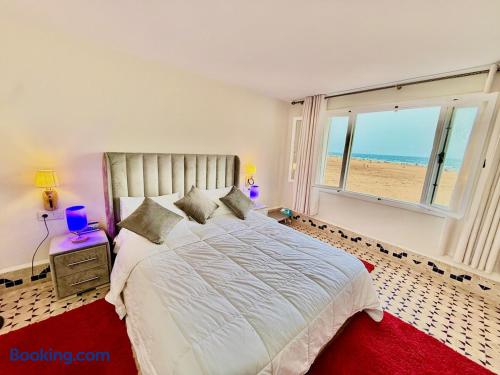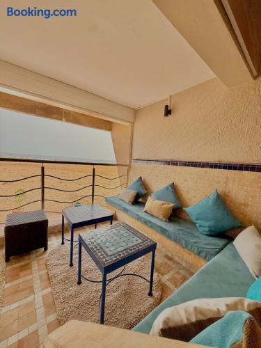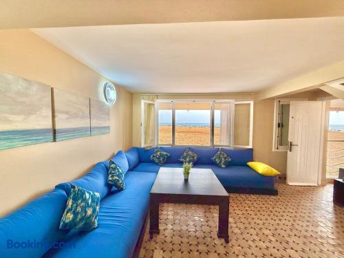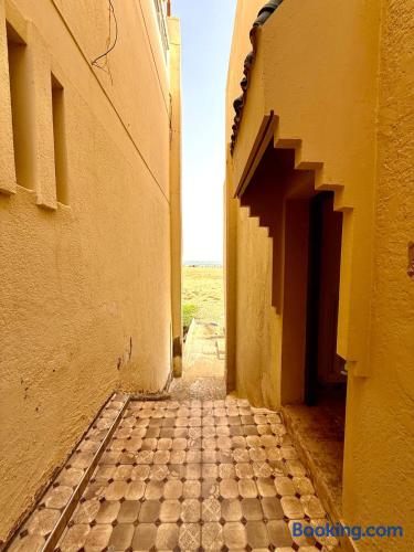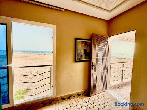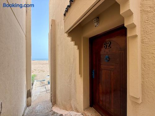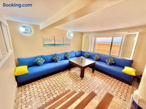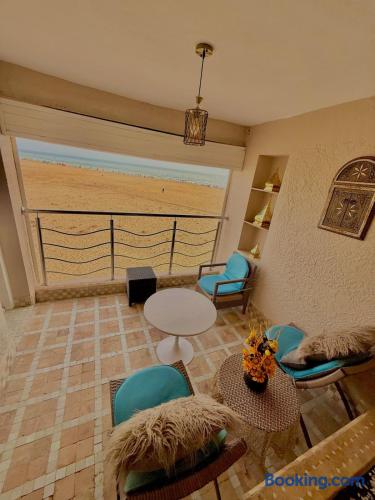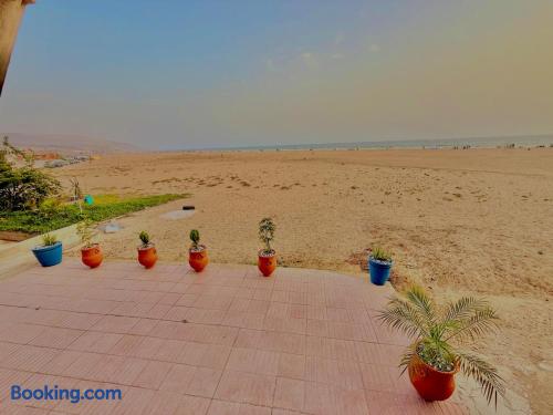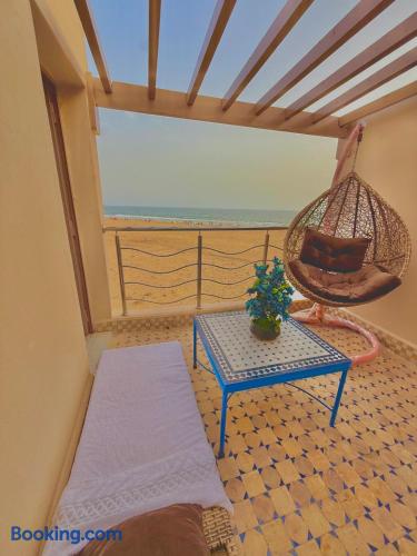 Ce logement paisible offre un séjour détente pour toute la famille,dans un cadre unique pieds dans l eau sur la magnifique plage d’Imi ouadar à 10mn de Taghazout.Ce logement offre un havre de paix dans une ambiance joliment décorée et travaillée avec des matériaux locaux bien sélectionnés en harmonie avec l environnement qui l entoure 2 chambres doubles, 1chambres avec 2 lits simples, 2 salon , une terrasse équipée d’une chaise longue et un fauteuil suspendu offrant une vie sublime sur la plage