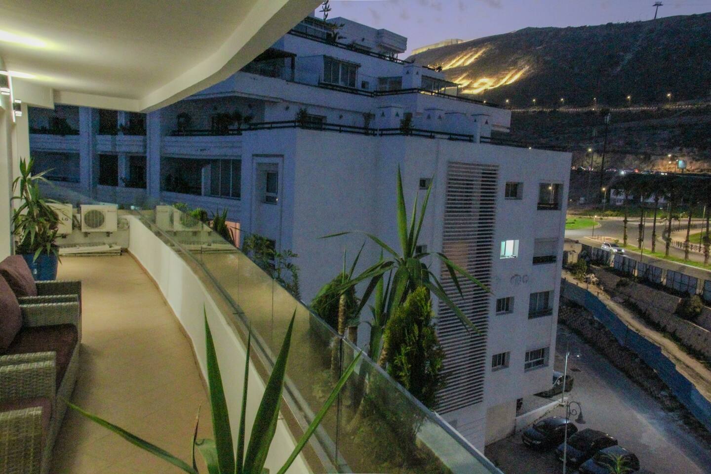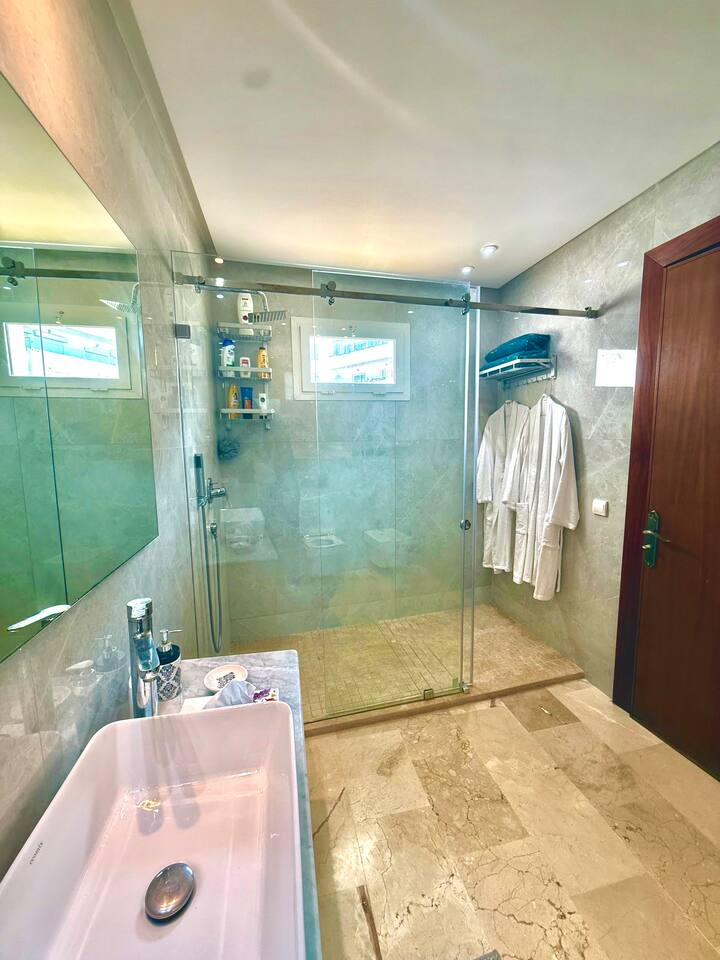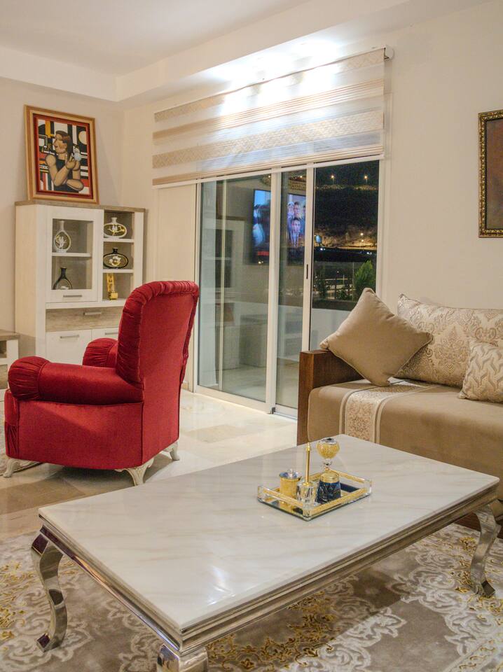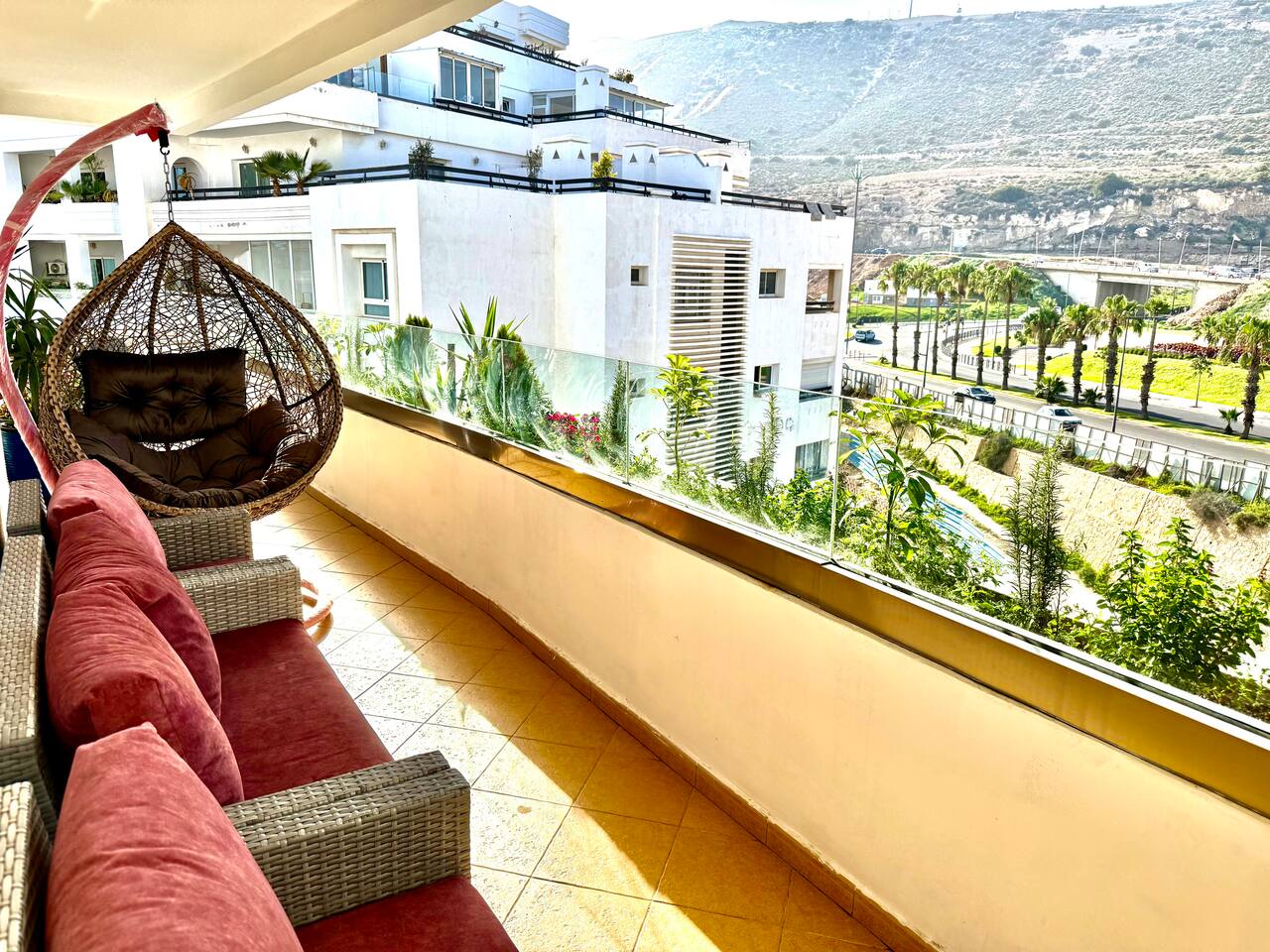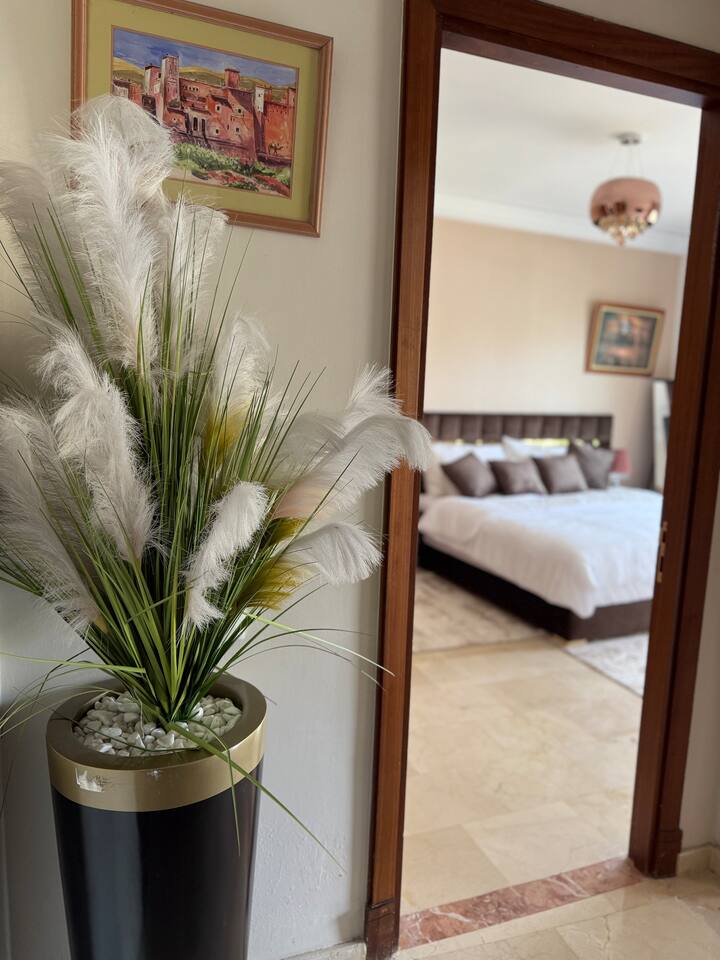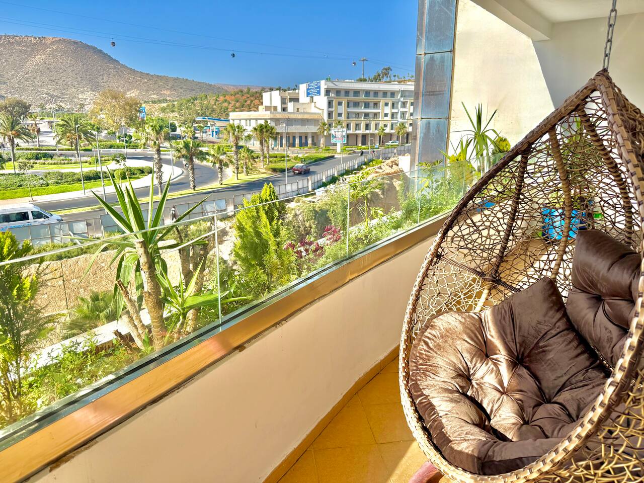 Welcome to your modern luxury retreat in the heart of Agadir Marina, perfect for family holidays, romantic getaways, or productive business trips. The open-plan living room invites you to relax on an elegant sectional sofa after a day of exploration. Step out onto the large, curved balcony, where you can unwind in the hanging chair with a drink and enjoy stunning mountain views. Prepare delicious meals in the fully equipped kitchen, complete with a Nespresso machine for your morning coffee. The apartment features two serene bedrooms designed for your comfort: * **Master Bedroom:** A spacious room with a plush king-size bed, a private en-suite bathroom, and a TV for late-night viewing. * **Second Bedroom:** Features two comfortable twin beds, a smart TV, and a dedicated desk, providing a convenient workspace. For those traveling with little ones, a crib and high chair are available. The entire apartment is equipped with high-speed Wi-Fi and air conditioning to ensure a comfortable stay.