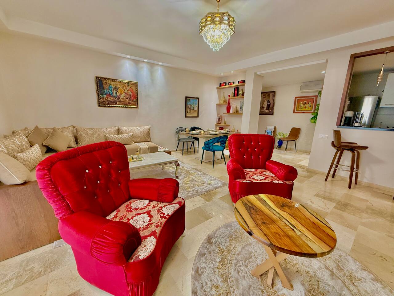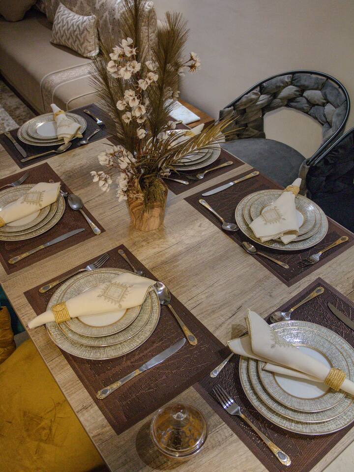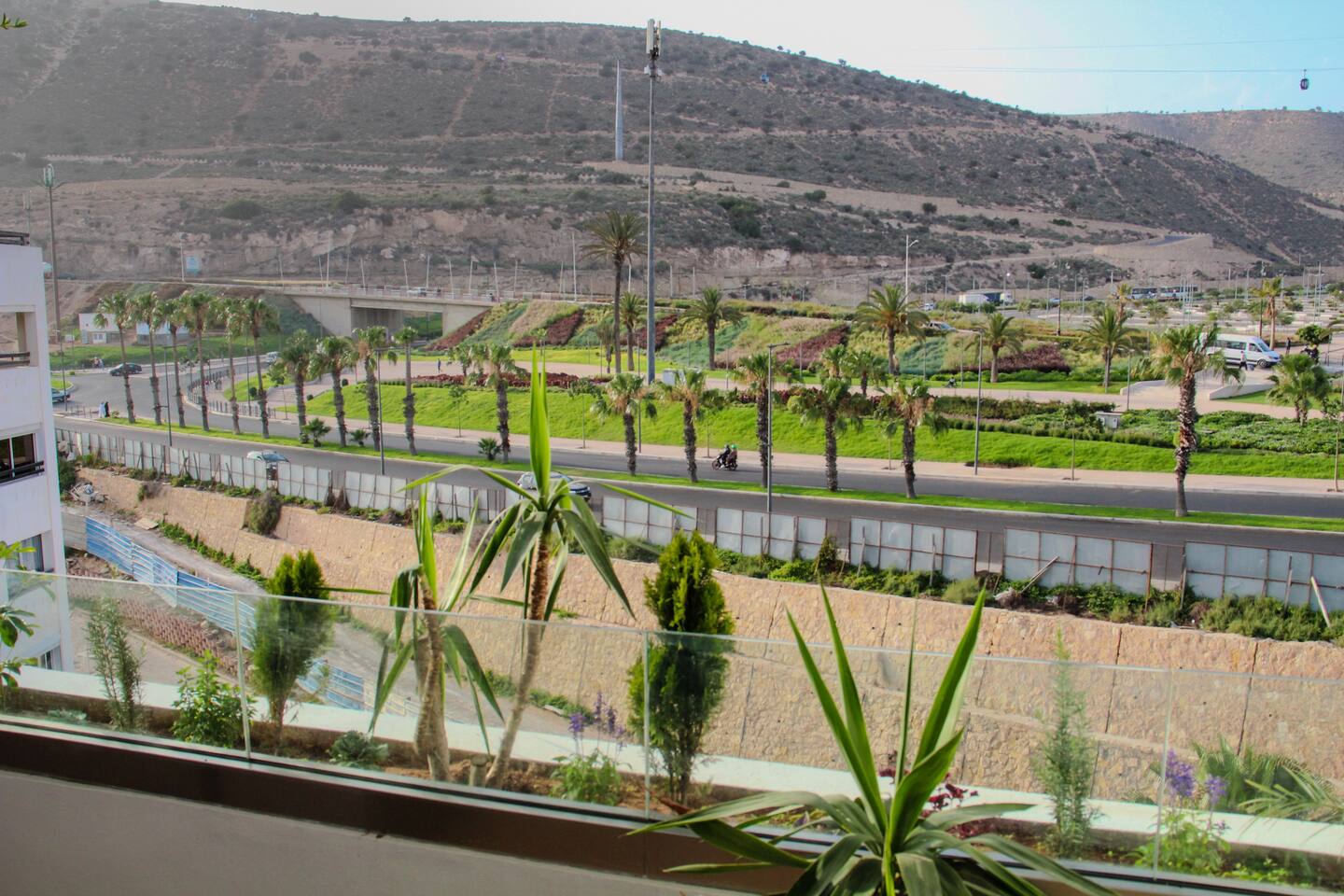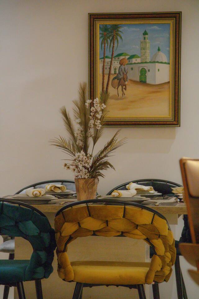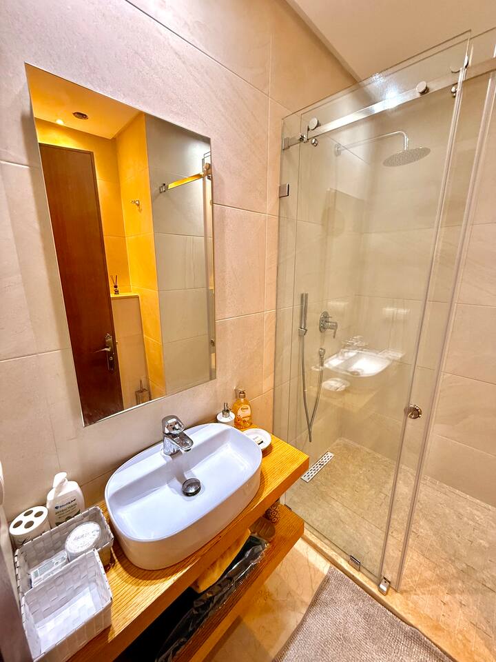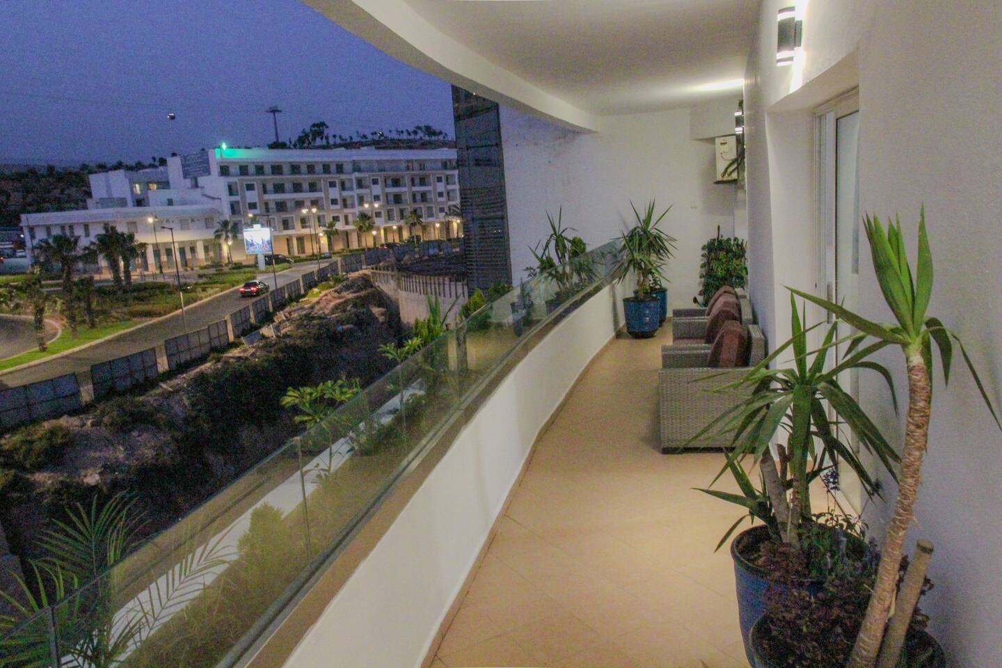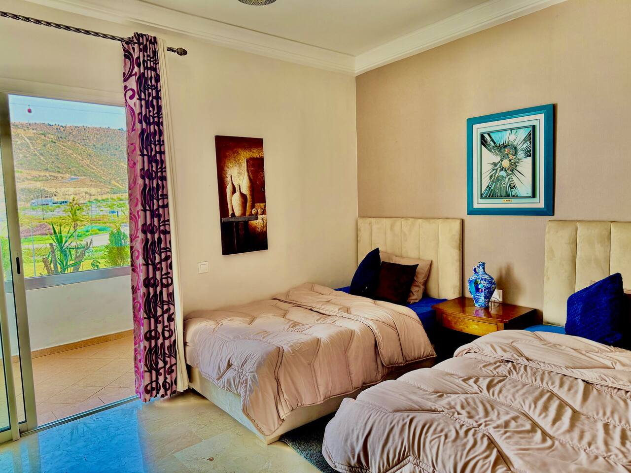 Welcome to your modern luxury retreat in the heart of Agadir Marina, perfect for family holidays, romantic getaways, or productive business trips. The open-plan living room invites you to relax on an elegant sectional sofa after a day of exploration. Step out onto the large, curved balcony, where you can unwind in the hanging chair with a drink and enjoy stunning mountain views. Prepare delicious meals in the fully equipped kitchen, complete with a Nespresso machine for your morning coffee. The apartment features two serene bedrooms designed for your comfort: * **Master Bedroom:** A spacious room with a plush king-size bed, a private en-suite bathroom, and a TV for late-night viewing. * **Second Bedroom:** Features two comfortable twin beds, a smart TV, and a dedicated desk, providing a convenient workspace. For those traveling with little ones, a crib and high chair are available. The entire apartment is equipped with high-speed Wi-Fi and air conditioning to ensure a comfortable stay.