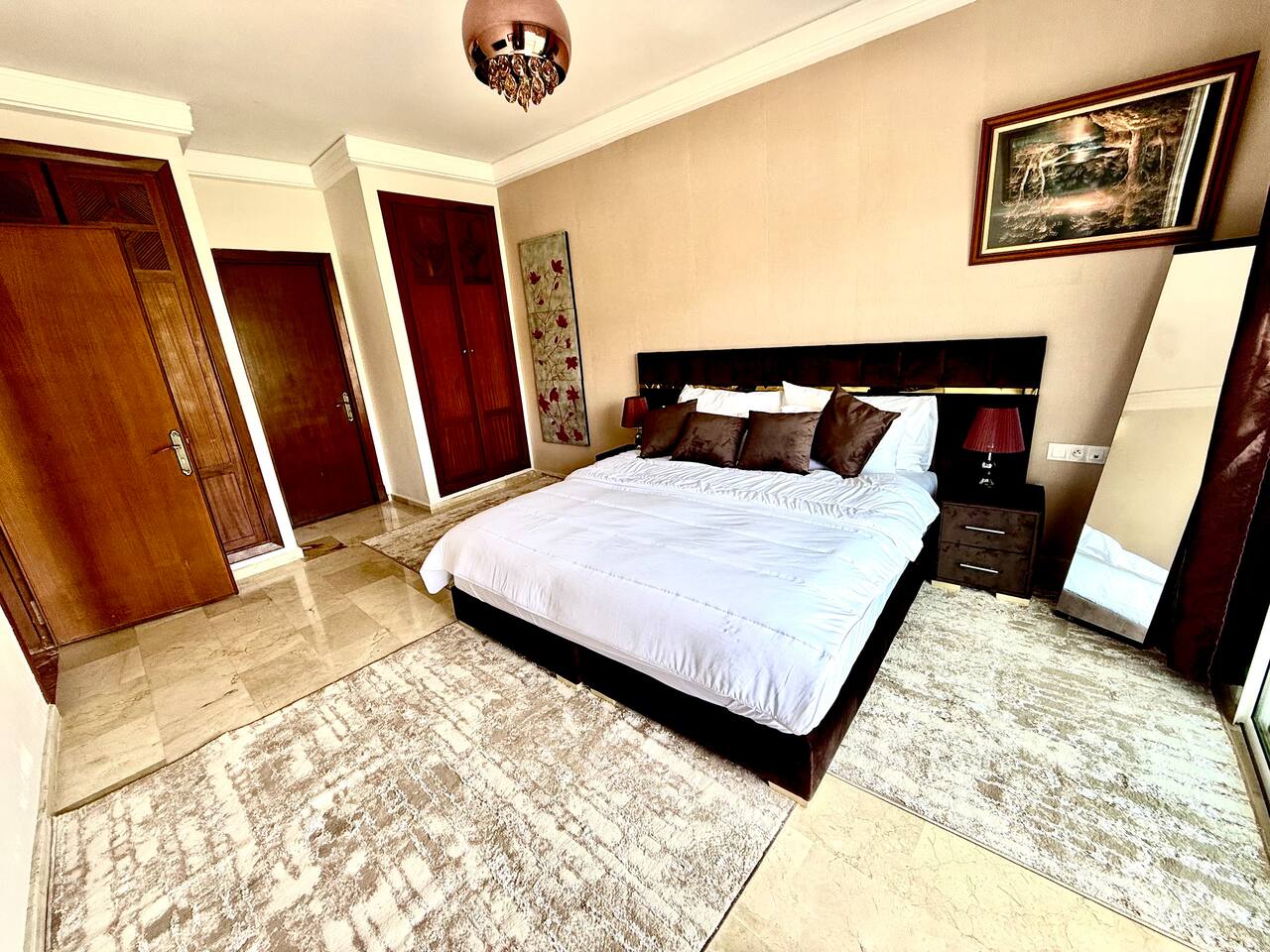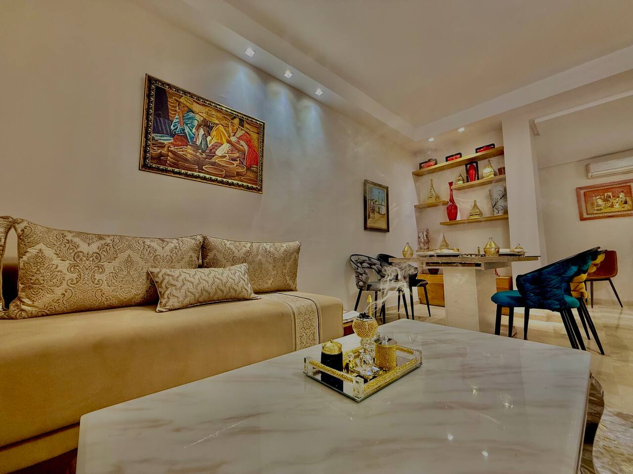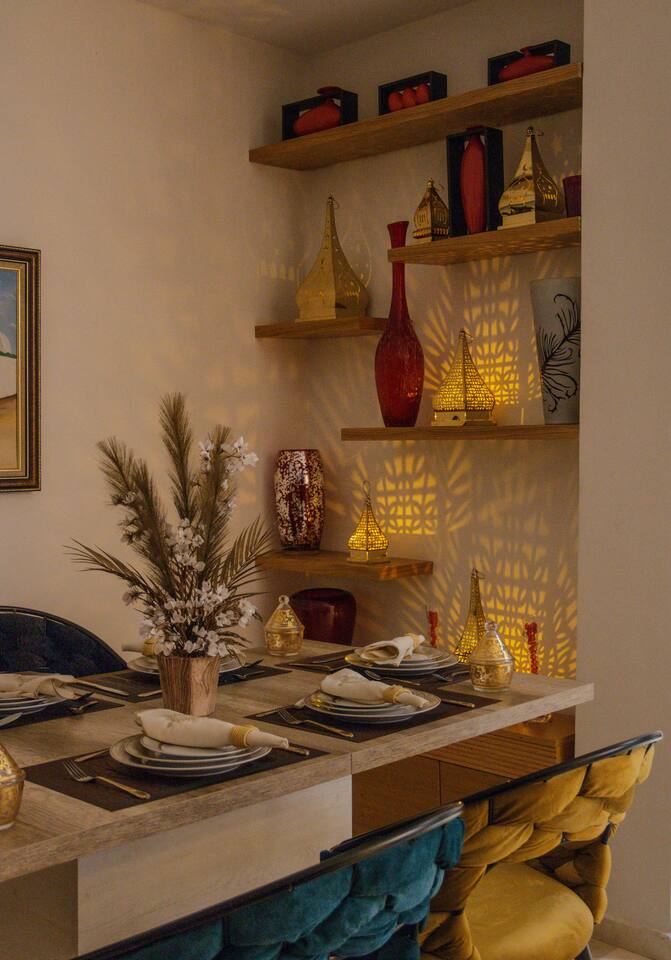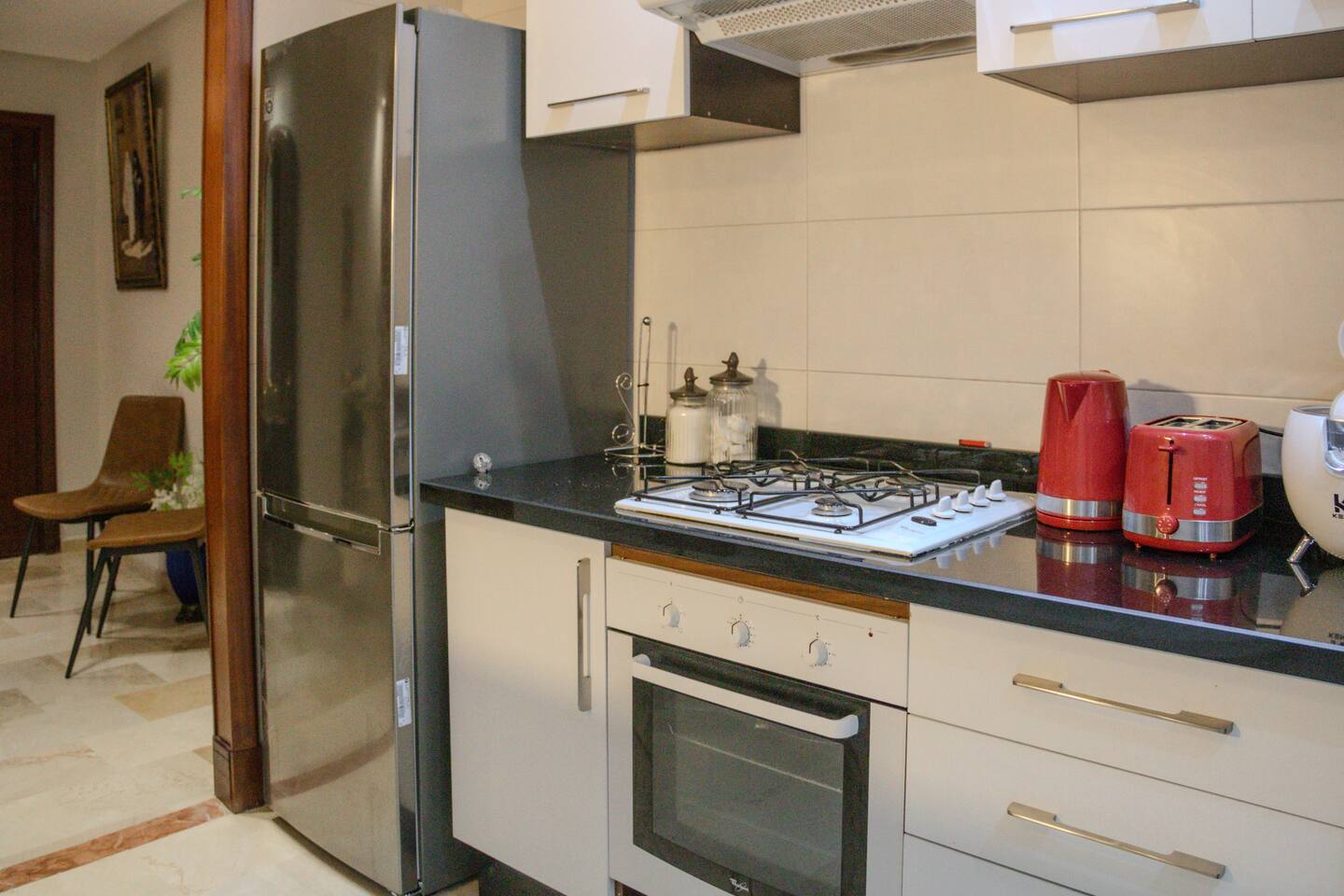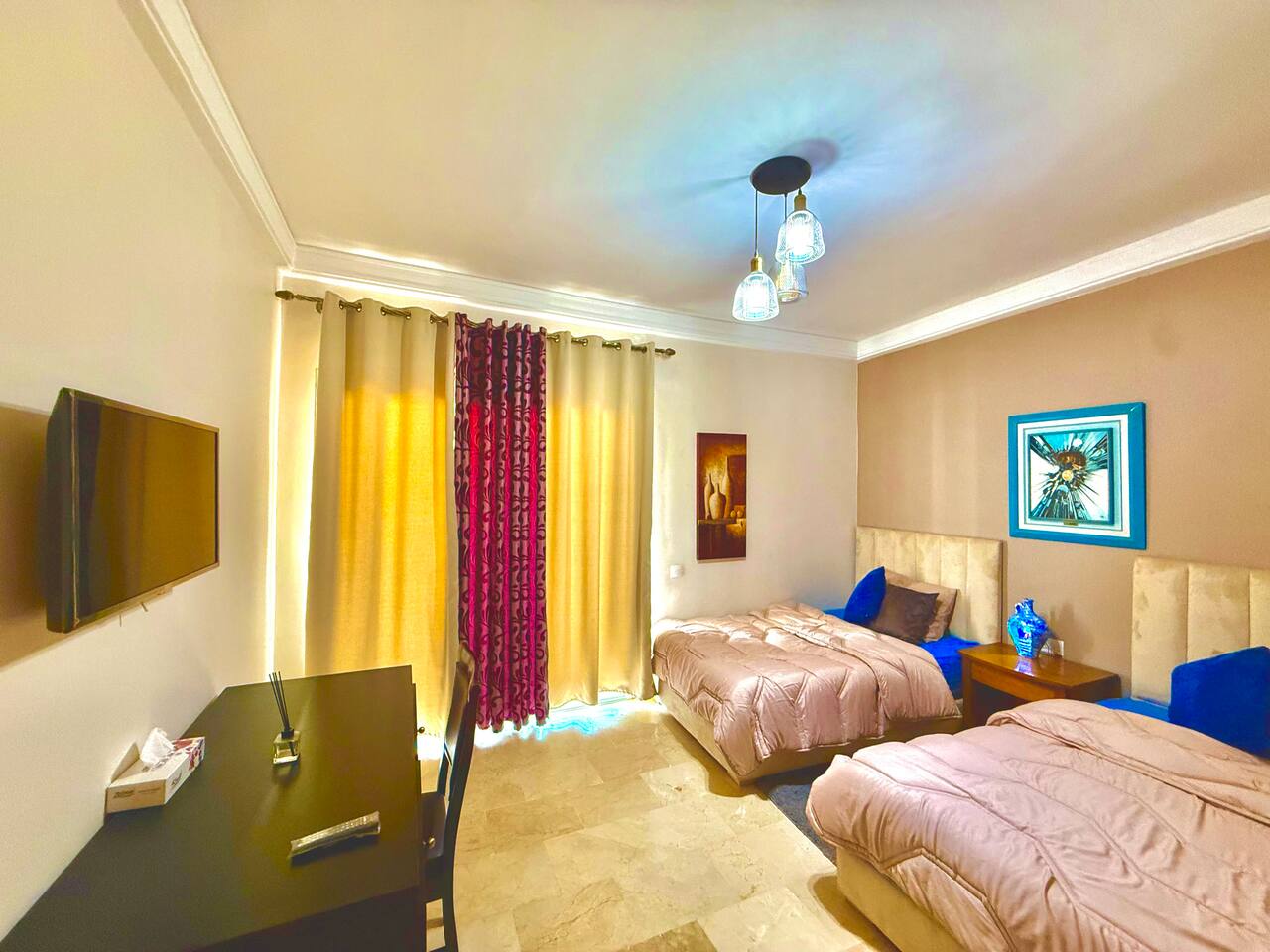 Welcome to your modern luxury retreat in the heart of Agadir Marina, perfect for family holidays, romantic getaways, or productive business trips. The open-plan living room invites you to relax on an elegant sectional sofa after a day of exploration. Step out onto the large, curved balcony, where you can unwind in the hanging chair with a drink and enjoy stunning mountain views. Prepare delicious meals in the fully equipped kitchen, complete with a Nespresso machine for your morning coffee. The apartment features two serene bedrooms designed for your comfort: * **Master Bedroom:** A spacious room with a plush king-size bed, a private en-suite bathroom, and a TV for late-night viewing. * **Second Bedroom:** Features two comfortable twin beds, a smart TV, and a dedicated desk, providing a convenient workspace. For those traveling with little ones, a crib and high chair are available. The entire apartment is equipped with high-speed Wi-Fi and air conditioning to ensure a comfortable stay.