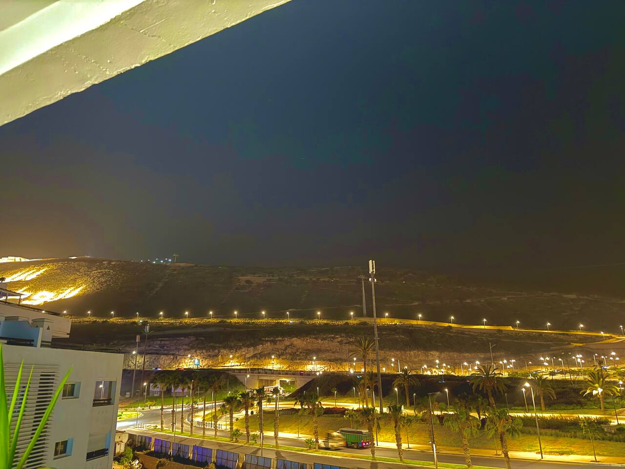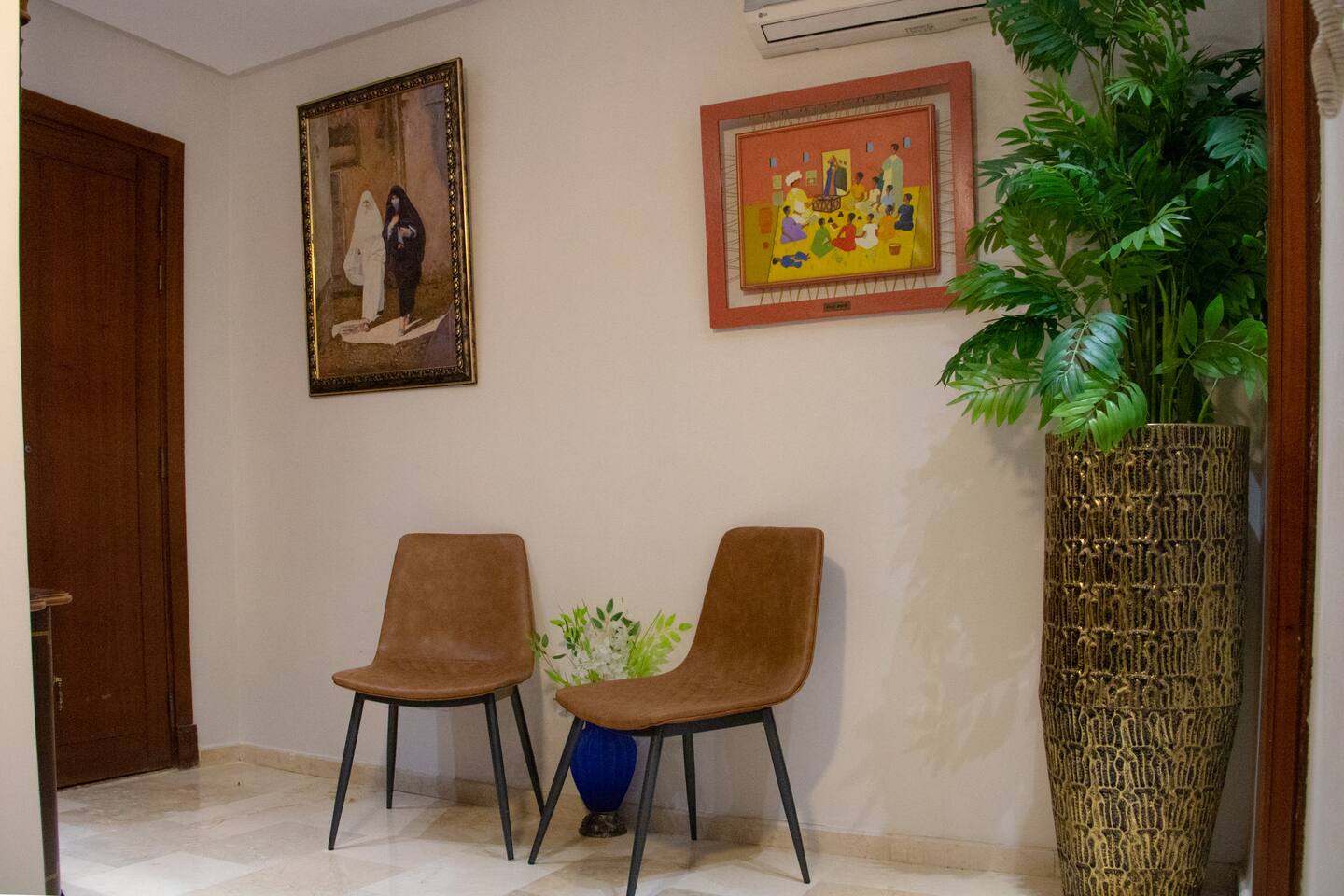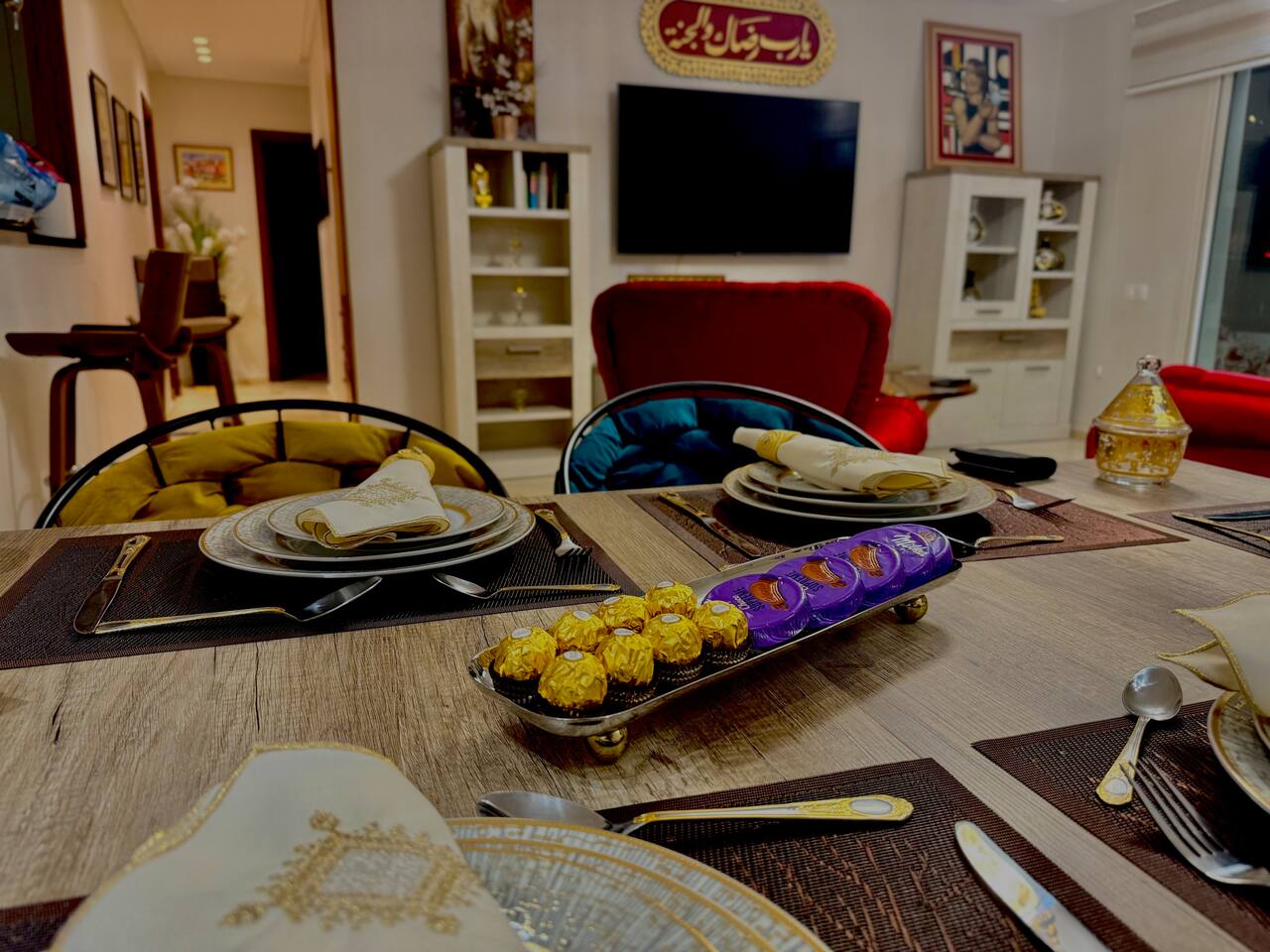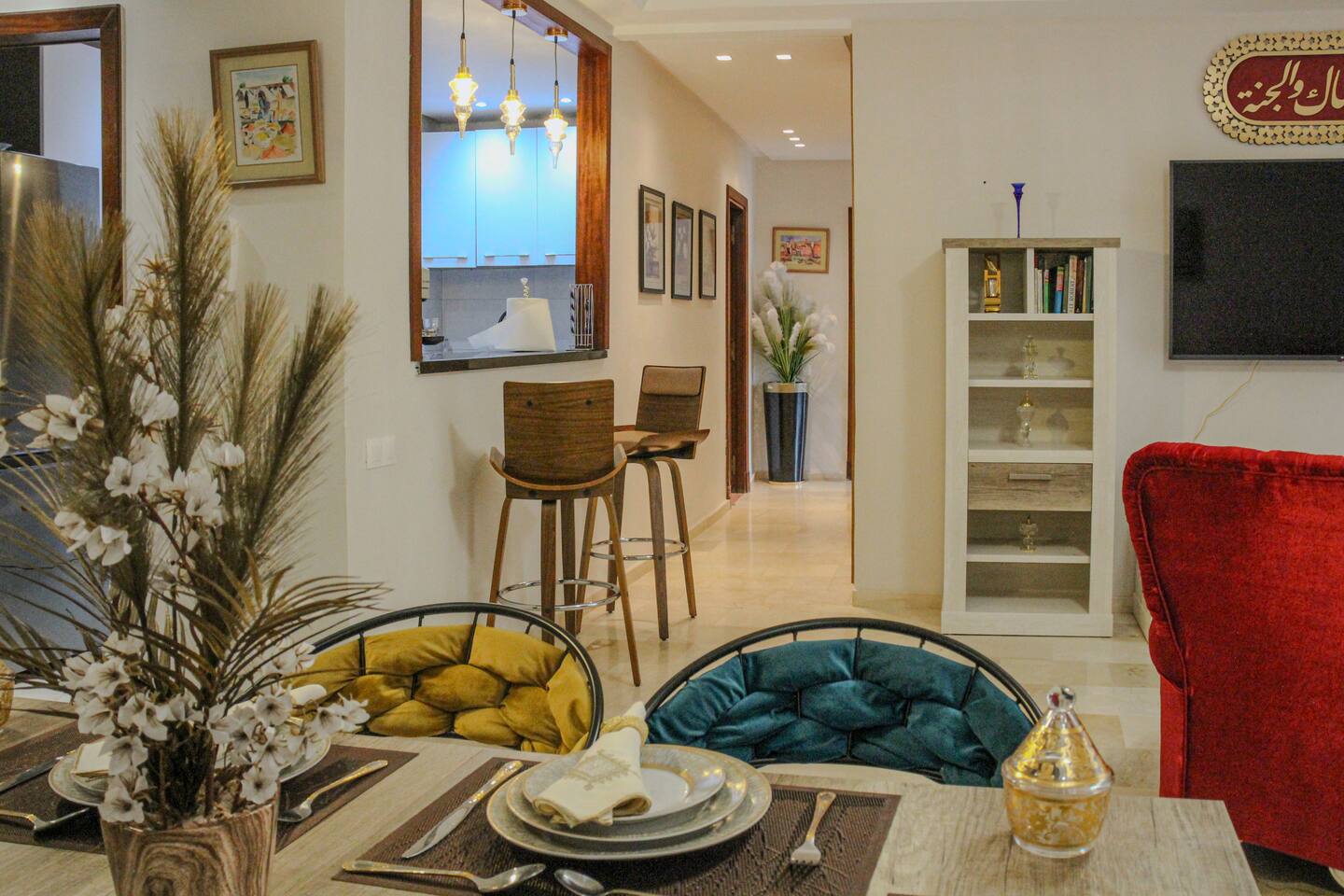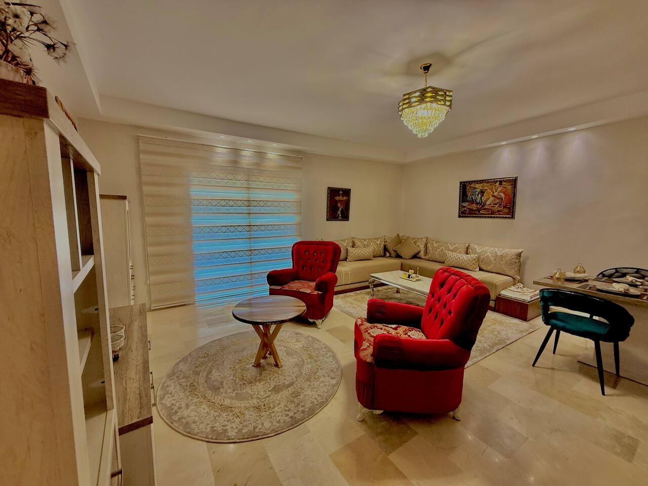 Welcome to your modern luxury retreat in the heart of Agadir Marina, perfect for family holidays, romantic getaways, or productive business trips. The open-plan living room invites you to relax on an elegant sectional sofa after a day of exploration. Step out onto the large, curved balcony, where you can unwind in the hanging chair with a drink and enjoy stunning mountain views. Prepare delicious meals in the fully equipped kitchen, complete with a Nespresso machine for your morning coffee. The apartment features two serene bedrooms designed for your comfort: * **Master Bedroom:** A spacious room with a plush king-size bed, a private en-suite bathroom, and a TV for late-night viewing. * **Second Bedroom:** Features two comfortable twin beds, a smart TV, and a dedicated desk, providing a convenient workspace. For those traveling with little ones, a crib and high chair are available. The entire apartment is equipped with high-speed Wi-Fi and air conditioning to ensure a comfortable stay.
