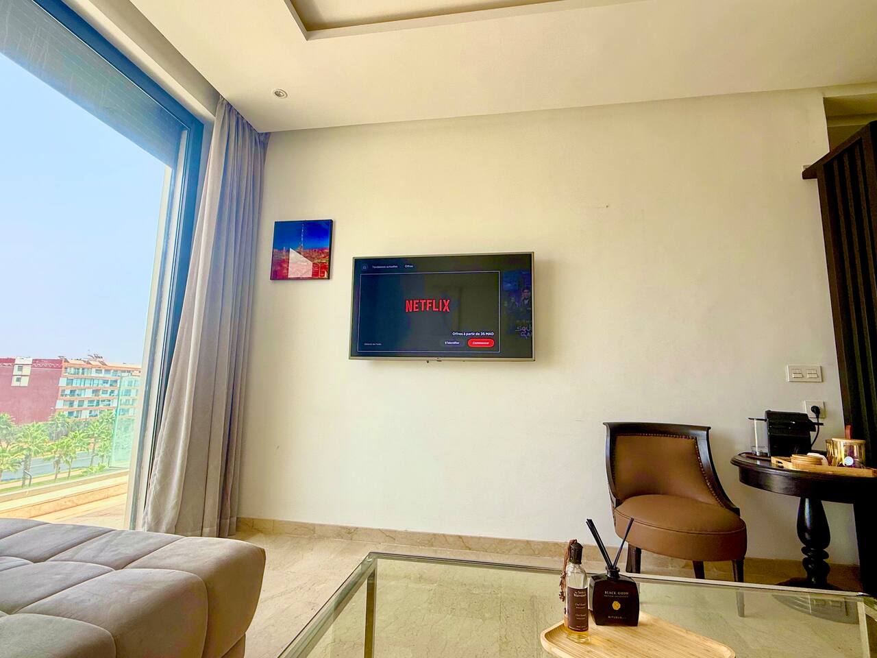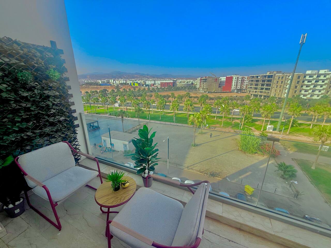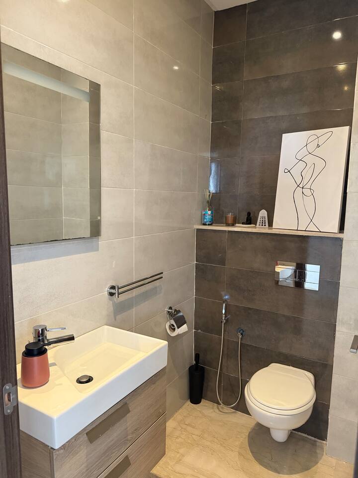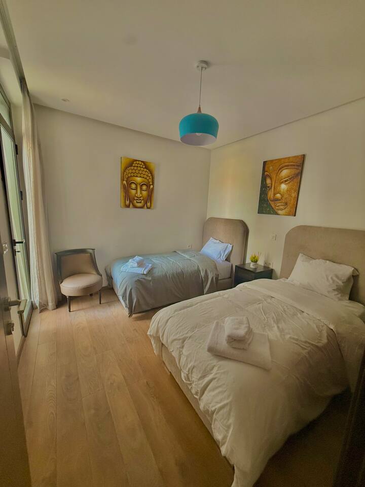 Welcome to your modern retreat in Agadir Bay, one of the most desirable neighborhoods. Designed with stylish decor for a cozy, home-like feel, this apartment is your perfect home base. The space features two bedrooms, two bathrooms, and a bright living area. Unwind after a day of exploring by streaming your favorite shows on the smart TV, connected with high-speed Fibre Wi-Fi. The fully stocked kitchen has everything you need during your stay. Step out onto the large balcony to enjoy city views.