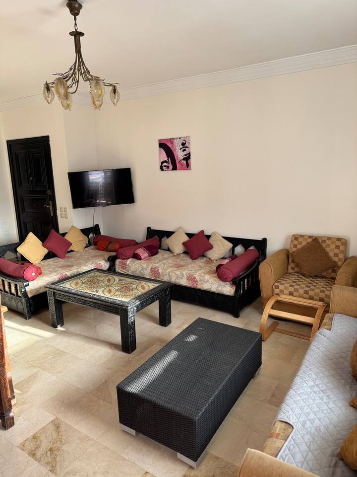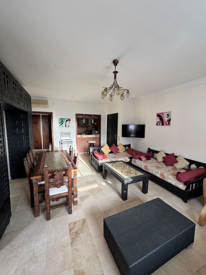 À deux pas de la très belle plage dorée d'Agadir, l’appartement est idéalement situé au cœur de la Marina d’Agadir avec promenade, cafés et restaurants au pied de l’immeuble. Chambre - Une chambre spacieuse avec lit queen-size et grands placards, très ensoleillée et ouverte sur la terrasse. Salle de bain attenante - Salle de bain privée avec baignoire, parfaite pour se détendre après la plage. Terrasse / Balcon - Grande terrasse meublée avec table à manger et vue directe sur la Marina pour des moments conviviaux. Salon - Grand salon lumineux avec trois canapés confortables et coin repas, s’ouvrant sur la terrasse via une large baie vitrée. Cuisine - Cuisine entièrement équipée avec vaisselle/ustensiles et petit comptoir pratique pour cafés et apéritifs. Deuxième salle de bain - Salle d’eau supplémentaire pour plus de confort en famille ou entre amis. Piscine - Accès à la grande piscine de la résidence pour profiter du soleil d’Agadir. Parking - Place de parking privée et sécurisée réservée aux résidents de la Marina. Ambiance Un logement calme, spacieux et très ensoleillé qui invite à un séjour chic et relaxant. Capacité Accueille confortablement 2 à 4 voyageurs, idéal pour couples, amis ou petite famille. Accès voyageurs Accès à tout l’appartement, à la piscine et aux espaces communs selon le règlement de la résidence. Règles & séjour Séjour minimum : 3 nuits, pièces d’identité obligatoires pour tous les voyageurs, et conformité aux règles locales : Les couples marocains non mariés sont interdits d'héberger dans notre appartement, sauf si ils disposent tous les deux de passeports étrangers